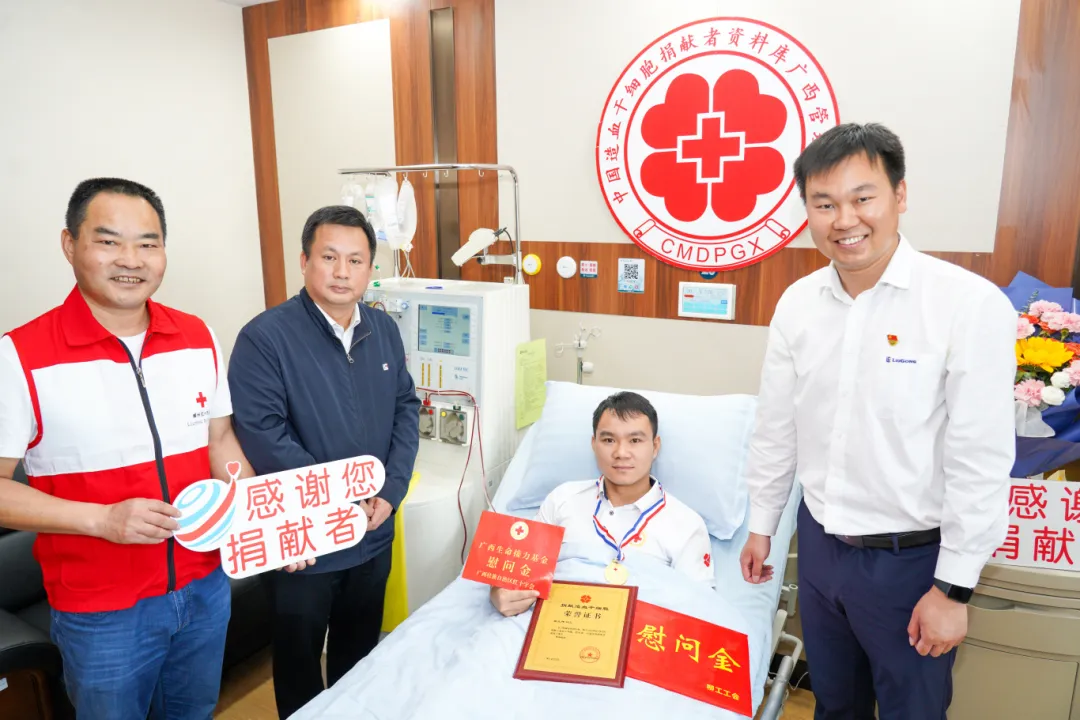 當天上午,柳工工會常務(wù)副主席李泳、柳工挖掘機事業(yè)部黨委副書記石祺祥與柳州市紅十字會黨組成員、副會長朱政等一同來到采集病房看望吳立偉,為他送去慰問,并頒發(fā)中國紅十字總會授予的獎牌和證書。