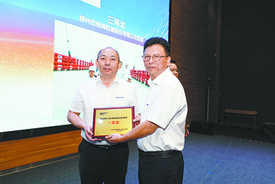 賴頌平(右)為“柳工2024-2025宣傳工作先進(jìn)集體”頒獎(jiǎng)。