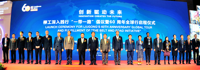 11月13日在江蘇常州召開的2017全球經銷商年會上,柳工正式啟動“深入實踐‘一帶一路’倡議暨60周年全球行”活動(如下圖)。來自政府、商會、柳工經銷商體系、金融機構以及媒體的嘉賓共同見證了這一活動。