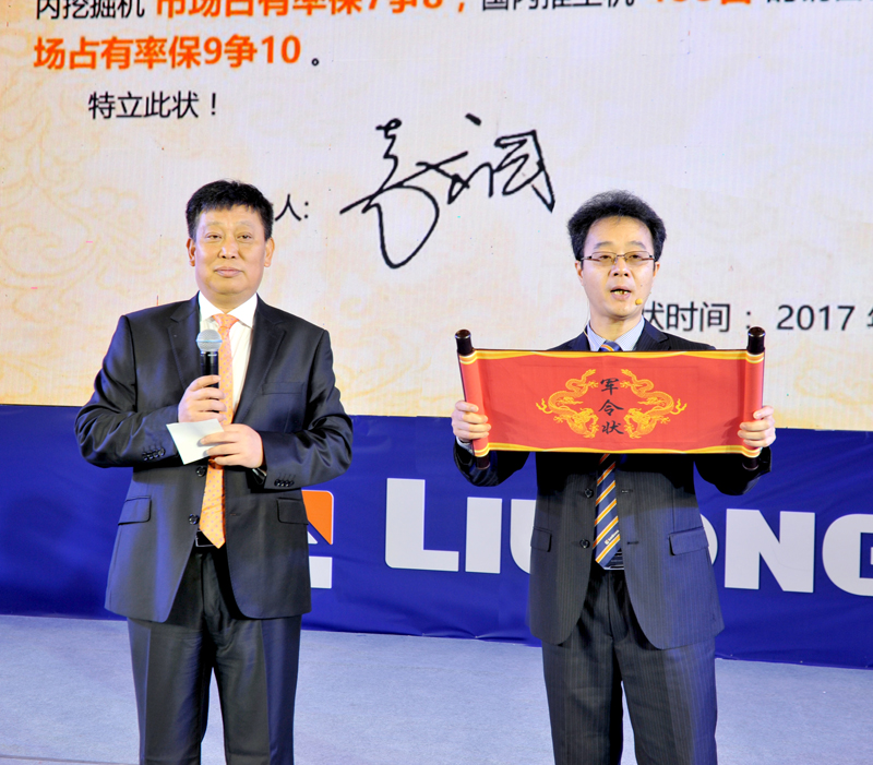活動現場舉行了軍令授旗儀式(如下圖)。柳工挖掘機、推土機的研發、采購、生產、營銷團隊分別接受領導下達的任務指令,并當場宣誓,保證完成任務!
