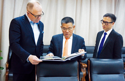 曾光安(中)向Pekka Vauramo(左)展示柳工紀念畫冊